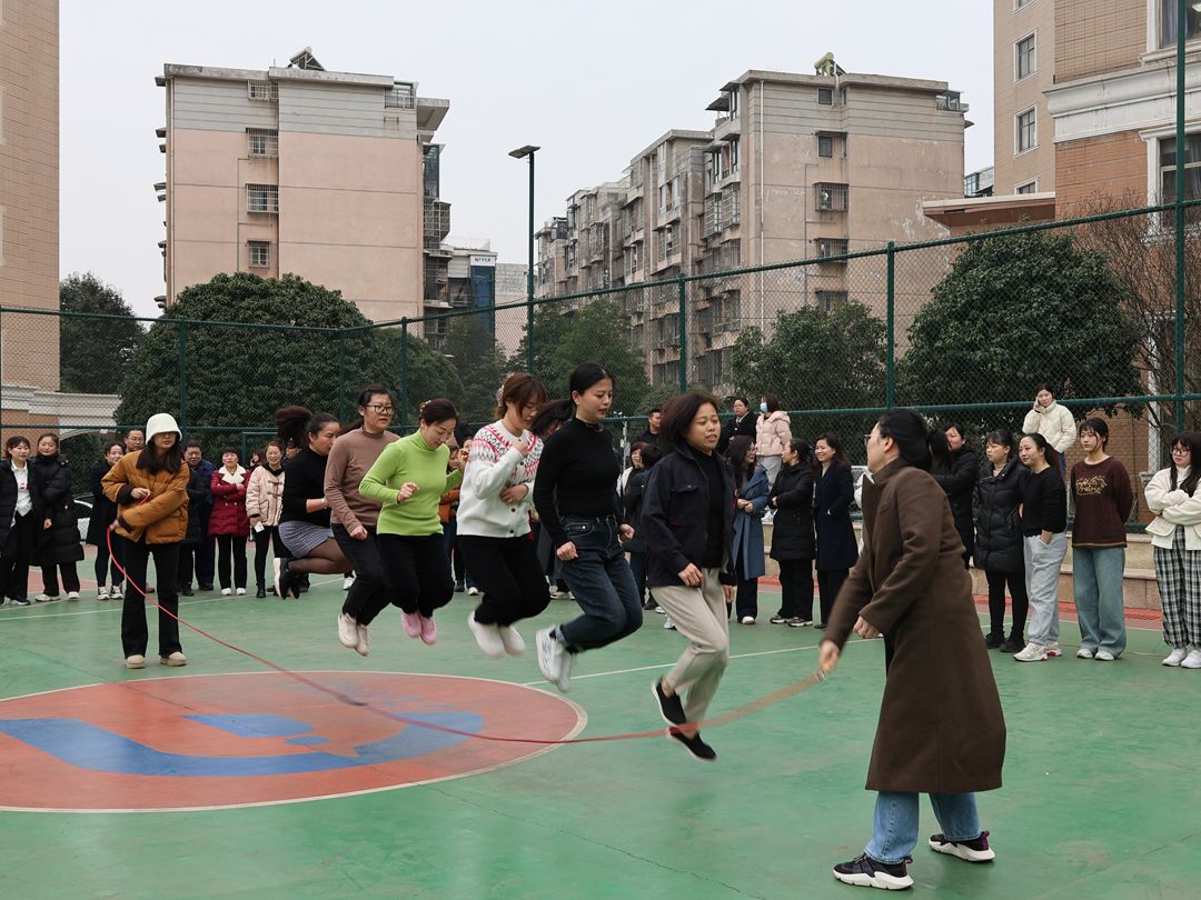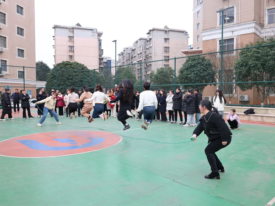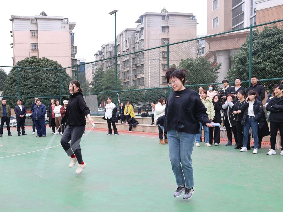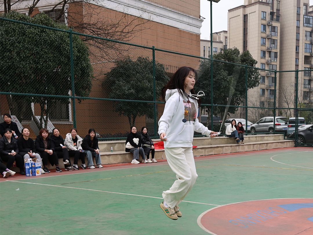 輪到單人賽了,大家早已躍躍欲試。三人一組,計時一分鐘。隨著手飛快地搖,繩快樂地翻,腳輕快地跳,籃球場上瞬間變成歡樂的海洋,吶喊聲歡笑聲聲聲不息。這些平時伏案工作鮮少運動的女人花,此刻釋放著熱情和活力,揮動著手中的繩,“跳”出她力量她精彩,表達著熱辣滾燙的生命追求、奮發(fā)向上的進取精神。